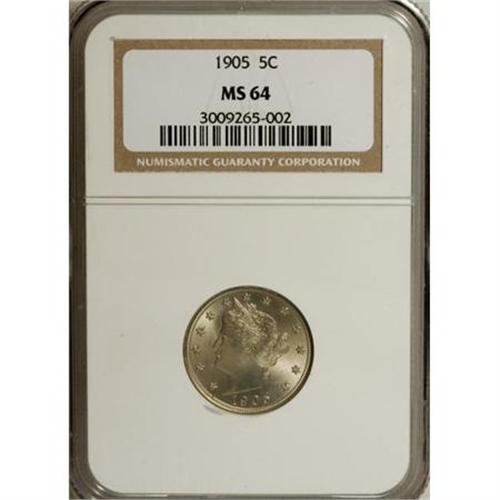 <B>1905 5C MS64 NGC.</B></I> NGC Census: (232/187). PCGS Population (340/249). Mintage: 29,827,276. Numismedia Wsl. Price for NGC/PCGS coin in MS64: $180. (#3866)<BR><BR><B>Coin Engraver:</B> Charles E. Barber<BR><BR><b>Shipping:</b> Coins & Currency (<a target="_blank" href="http://www.heritageauctions.com/common/shipping.php">view shipping information</a>)