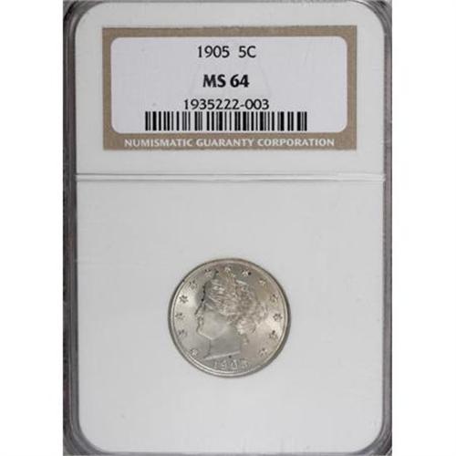 <B>1905 5C MS64 NGC.</B></I> NGC Census: (239/191). PCGS Population (348/254). Mintage: 29,827,276. Numismedia Wsl. Price for NGC/PCGS coin in MS64: $180. (#3866)<BR><BR><B>Coin Engraver:</B> Charles E. Barber<BR><BR><b>Shipping:</b> Coins & Currency (<a target="_blank" href="http://www.heritageauctions.com/common/shipping.php">view shipping information</a>)