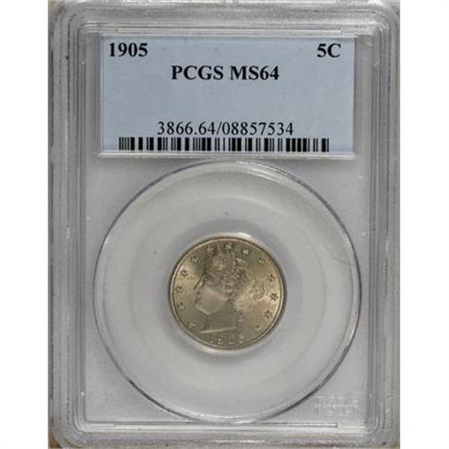 <B>1905 5C MS64 PCGS.</B></I> PCGS Population (339/248). NGC Census: (232/187). Mintage: 29,827,276. Numismedia Wsl. Price for NGC/PCGS coin in MS64: $180. (#3866)<BR><BR><B>Coin Engraver:</B> Charles E. Barber<BR><BR><b>Shipping:</b> Coins & Currency (<a target="_blank" href="http://www.heritageauctions.com/common/shipping.php">view shipping information</a>)