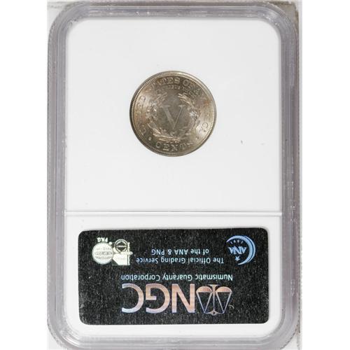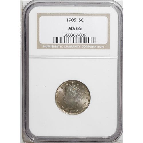 <B>1905<5C> MS65 NGC.</B></I> Sunset-red and orange toning drapes this highly lustrous and lovely Gem. Nicely struck with an isolated spot of dark brown on Liberty's coronet.