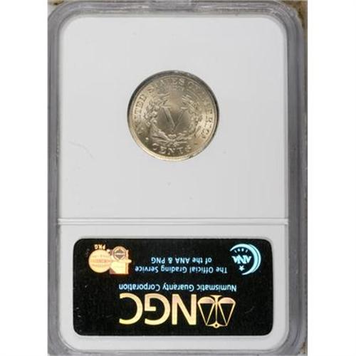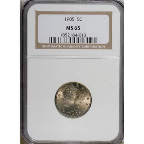 <B>1905 5C MS65 NGC.</B></I> From a high mintage of nearly 30 million pieces, relatively few have survived as Gems. This example has beautiful luster and equally appealing champagne-gray coloration. Softly struck on the obverse stars, and on the lower left segment of the reverse wreath; but exquisitely preserved and distraction-free. <BR><BR><b>Shipping:</b> Coins & Currency (<a target="_blank" href="http://www.heritageauctions.com/common/shipping.php">view shipping information</a>)