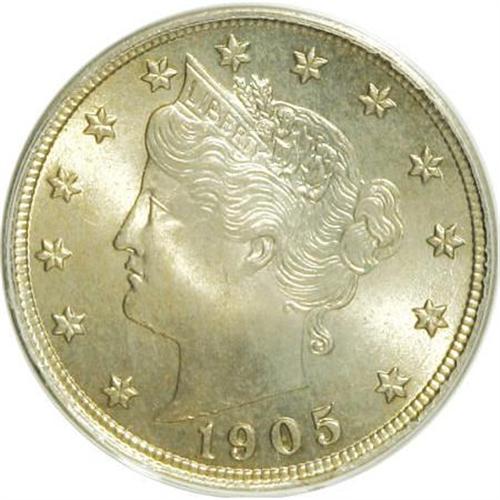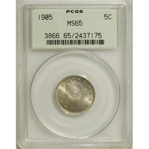 <B>1905 5C MS65 PCGS.</B></I> PCGS Population (198/64). NGC Census: (151/46). Mintage: 29,827,276. Numismedia Wsl. Price for NGC/PCGS coin in MS65: $560. (#3866)<BR><BR><B>Coin Engraver:</B> Charles E. Barber<BR><BR><b>Shipping:</b> Coins & Currency (<a target="_blank" href="http://www.heritageauctions.com/common/shipping.php">view shipping information</a>)