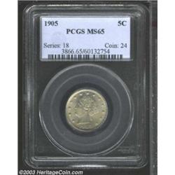 <TABLE cellSpacing=0 cellPadding=0 width="100%" bgColor=#000000 border=0><TBODY><TR><TD width="100%"><TABLE cellSpacing=1 cellPadding=3 width="100%" border=0><TBODY><TR><TD width="100%" bgColor=#79735c><FONT face=arial color=#ffffff size=3><B>Description</B> </FONT></TD></TR><TR><TD width="100%" bgColor=#ffffff><FONT face=arial size=2><B>1905 5C MS65 PCGS.</B></I> Boldly struck, with typical softness on the reverse left ear of corn and a partial strike on obverse star 7. A few slide marks are seen near the center of each side. Population: 154 in 65, 41 finer (8/03). </FONT></TD></TR></TBODY></TABLE></TD></TR></TBODY></TABLE><BR><A name=PricesRealized></A><TABLE cellSpacing=0 cellPadding=0 width="100%" bgColor=#000000 border=0><TBODY><TR><TD width="100%"><TABLE cellSpacing=1 cellPadding=3 width="100%" border=0><TBODY><TR><TD width="100%" bgColor=#79735c><A name=PR><FONT face=arial color=#ffffff size=3><B>Previous Prices from Heritage Auctions</B> </FONT></A></TD></TR><TR><TD bgColor=#f6f6ed><TABLE cellSpacing=0 cellPadding=0 width="100%" border=1><TBODY><TR><TD align=middle width="33%"><B>Date</B></TD><TD align=middle width="33%"><B>Service</B></TD><TD align=middle width="33%"><B>Price</B></TD></TR><TR bgColor=whitesmoke><TD width="33%"><B>01/06/1996</B></TD><TD width="33%">PCGS</TD><TD width="33%">$297.00</TD></TR><TR bgColor=whitesmoke><TD width="33%"><B>05/01/1999</B></TD><TD width="33%">PCGS</TD><TD width="33%">$633.00</TD></TR><TR bgColor=whitesmoke><TD width="33%"><B>11/12/2002</B></TD><TD width="33%">NGC</TD><TD width="33%">$391.00</TD></TR><TR bgColor=whitesmoke><TD width="33%"><B>11/23/2002</B></TD><TD width="33%">PCGS</TD><TD width="33%">$425.50</TD></TR><TR bgColor=whitesmoke><TD width="33%"><B>10/01/2002</B></TD><TD width="33%">NGC</TD><TD width="33%">$379.50</TD></TR><TR bgColor=whitesmoke><TD width="33%"><B>07/30/2002</B></TD><TD width="33%">NGC</TD><TD width="33%">$460.00</TD></TR><TR bgColor=whitesmoke><TD width="33%"><B>02/23/2002</B></TD><TD width="33%">NGC</TD><TD width="33%">$373.75</TD></TR><TR bgColor=whitesmoke><TD width="33%"><B>05/31/2001</B></TD><TD width="33%">NGC</TD><TD width="33%">$345.00</TD></TR><TR bgColor=whitesmoke><TD width="33%"><B>12/19/2000</B></TD><TD width="33%">NGC</TD><TD width="33%">$350.00</TD></TR><TR bgColor=whitesmoke><TD width="33%"><B>03/18/2003</B></TD><TD width="33%">PCGS</TD><TD width="33%">$471.50</TD></TR><TR bgColor=whitesmoke><TD width="33%"><B>10/10/1999</B></TD><TD width="33%">NGC</TD><TD width="33%">$274.85</TD></TR><TR bgColor=whitesmoke><TD width="33%"><B>09/30/2002</B></TD><TD width="33%">PCGS</TD><TD width="33%">$483.00</TD></TR><TR bgColor=whitesmoke><TD width="33%"><B>10/04/2000</B></TD><TD width="33%">PCGS</TD><TD width="33%">$402.50</TD></TR><TR bgColor=whitesmoke><TD width="33%"><B>05/13/2003</B></TD><TD width="33%">NGC</TD><TD width="33%">$391.00</TD></TR></TBODY></TABLE></TD></TR><TR><TD bgColor=#ffffff><FONT face=arial size=1 ?>PLEASE NOTE: All prices realized reflect the final hammer price PLUS the buyer's premium in auctions that charge a buyer's premium. Each item has a notation at the top of the listing indicating whether that lot included a buyer's premium. Example: A item that sells with a final hammer price of $100 and a 20% buyer's premium will display with a price realized of $120. All information listed is intended to be as accurate as possible, but errors are possible. Please use this guide carefully and inform us of any inaccuracies. </FONT></TD></TR></TBODY></TABLE></TD></TR></TBODY></TABLE><BR><TABLE cellSpacing=0 cellPadding=0 width="100%" bgColor=#000000 border=0><TBODY><TR><TD width="100%"><TABLE cellSpacing=1 cellPadding=3 width="100%" border=0><TBODY><TR><TD width="100%" bgColor=#79735c colSpan=6><FONT face=arial color=#ffffff size=3><B>Price Guide*</B> </FONT></TD></TR><TR bgColor=#f6f6ed><TD align=middle><B>Grade</B> </TD><TD align=middle><B>Coin World<BR>(Trends)</B> </TD><TD align=middle><B>Numismedia<BR>Retail</B> </TD><TD align=middle><B>Numismedia<BR>Wholesale</B> </TD><TD align=middle><B>Coin<BR>Universe</B> </TD><TD align=middle><B>Heritage<BR>Value Index</B> </TD></TR><TR bgColor=#ffffff><TD align=middle>64</TD><TD align=right>$180.00</TD><TD align=right>$205.00</TD><TD align=right>$164.00</TD><TD align=right>$185.00</TD><TD align=right>$135.63</TD></TR><TR style="FONT-WEIGHT: bold" bgColor=#cccfdd><TD align=middle>65</TD><TD align=right>$535.00</TD><TD align=right>$480.00</TD><TD align=right>$384.00</TD><TD align=right>$750.00</TD><TD align=right>$406.63</TD></TR><TR bgColor=#ffffff><TD align=middle>66</TD><TD align=right>$1,200.00</TD><TD align=right>---</TD><TD align=right>$900.00</TD><TD align=right>$1,950.00</TD><TD align=right>$1,076.67</TD></TR><TR bgColor=#ffffff><TD colSpan=6><FONT size=1>*All information listed is intended to be as accurate as possible, but errors are possible. No item may be returned or refused based on this information which is provided as a service to our customers. You should contact each pricing source directly to determine the accuracy of this information. </FONT></TD></TR></TBODY></TABLE></TD></TR></TBODY></TABLE><BR><TABLE cellSpacing=0 cellPadding=0 width="100%" bgColor=#000000 border=0><TBODY><TR><TD width="100%"><TABLE cellSpacing=1 cellPadding=3 width="100%" border=0><TBODY><TR><TD width="100%" bgColor=#79735c><FONT face=arial color=#ffffff size=3><B>Population Guide</B> </FONT></TD></TR><TR bgColor=#ffffff><TD align=middle><!-- Begin Output of Population Grid--><TABLE cellSpacing=0 cellPadding=0 width="100%" border=0><TBODY><TR><TD vAlign=center><TABLE cellSpacing=0 width="100%" border=1 cellsadding="3"><TBODY><TR><TD vAlign=center><TABLE cellSpacing=0 cellPadding=3 width="100%" border=1><TBODY><TR><TD vAlign=center align=middle bgColor=#f0f1e8 colSpan=2 <CENTER><FONT face=Arial size=2><B>PCGS Pop </B></FONT><CENTER></CENTER></TD><TD vAlign=center align=middle bgColor=#f0f1e8 colSpan=2><CENTER><FONT face=Arial size=2><B>NGC Pop</B></CENTER></FONT></T