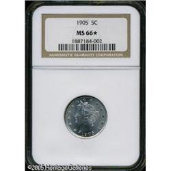 <B>1905 5C MS66 <img border='0' src='http://www.heritagecoins.com/images/star.gif' width=10 height=10> NGC.</B></I> A stone-white premium Gem with outstanding cartwheel luster and nearly pristine surfaces. A few right side stars and the left ear of corn are typically defined, the portrait is exquisitely struck. As of (1/05), NGC has certified only this piece as MS66 <img border='0' src='http://www.heritagecoins.com/images/star.gif' width=10 height=10>, and one finer as MS67 without a star designation. Lot:5894