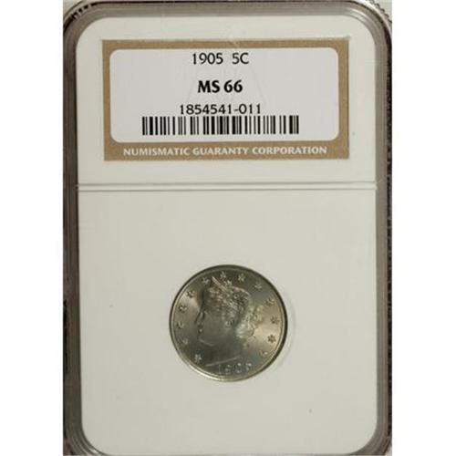 <B>1905 5C MS66 NGC.</B></I> Despite a mintage of almost 30 million pieces, a tiny fraction of those pieces survive as Premium Gems today. This attractive, highly lustrous example offers sky-blue, ice-blue, and gold-green patina over each side. Well-defined and pleasing. Census: 35 in 66, 2 finer (7/07).<BR><BR><B>Coin Engraver:</B> Charles E. Barber<BR><BR><b>Shipping:</b> Coins & Currency (<a target="_blank" href="http://www.heritageauctions.com/common/shipping.php">view shipping information</a>\)