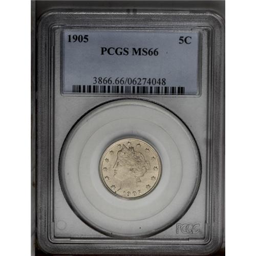<B>1905<5C> MS66 PCGS.</B></I> Champagne-gray patina is slightly deeper on the reverse. The design elements are well impressed, save for the corn ear and leaves left of the bowknot. Population: 55 in 66, 0 finer (3/06). <BR><BR><B>Important notice:</B> Heritage usually auctions material at the rate of 200-250 lots per hour. On some occasions eBay Live bid software or the Internet may not be able to keep up with the pace of the auction. We recommend placing a realistic absentee bid now as insurance to avoid disappointment. Occasionally the auctioneer may eliminate or reject an eBay Live bid, and the auctioneer may also reopen a lot after the close of the eBay live bidding (usually because we missed an audience bid), and may reject your bid even if it shows you as the winning bidder. By bidding via eBay Live, you agree that Heritage may award the lot to another bidder at its sole discretion under the circumstances described above or any other reasonable circumstances. Since eBay bids are not shown to us until we open the lot on the floor, we treat those bids just like floor bids. In most cases the floor responds before the eBay bid is presented to us, due to Internet lag time, so for consistency we have made it a policy that floor bids are always considered first over tie eBay live bids. Also please note that all Heritage lots purchased through eBay Live carry a 20% Buyer's Premium. Please make sure you read the Terms and Conditions before you bid. This lot is being auctioned in conjunction with a live floor auction by Heritage Galleries & Auctioneers. All final auction and invoice information will be supplied by Heritage Galleries & Auctioneers, and all other information should be considered preliminary. Lot:951 <BR><BR><B>Winning Notification and Billing:</B> After the FINAL session in this auction is complete, Heritage will send e-mail and snail mail invoices. This process normally takes several days. All final auction and invoice information will be supplied by Heritage Galleries & Auctioneers, and all other information should be considered preliminary. <BR><BR>This auction will be conducted on a live auction floor and over the Internet through eBay Live. If you choose to place an absentee bid, please take a moment to <font color='#0000ff'><u><a href='http://pages.ebay.com/liveauctions/help/before/laabsentee.html'>learn how eBay Live absentee bidding works</a></u></font><font color='#000000'>