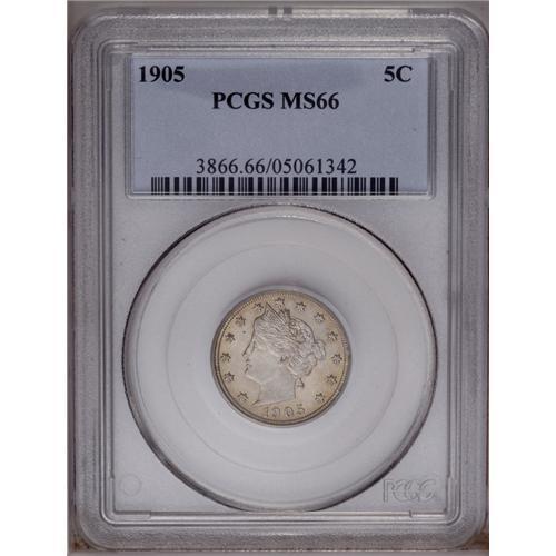 <B>1905<5C> MS66 PCGS.</B></I> Golden-brown and lime tints adorn this lustrous and meticulously struck Premium Gem. A single slide mark on the cheek, otherwise immaculate. Population: 54 in 66, 0 finer (1/06).