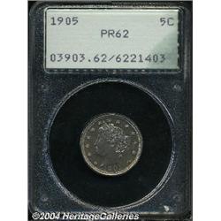 <B>1905<5C> PR62 PCGS.</B></I> An expertly struck specimen with attractive peach, sky-blue, and lime-green colors. A conservatively graded older holder example. <BR><BR><B>Important notice:</B> Heritage usually auctions material at the rate of 200-250 lots per hour. On some occasions eBay Live bid software or the Internet may not be able to keep up with the pace of the auction. We recommend placing a realistic absentee bid now as insurance to avoid disappointment. Occasionally the auctioneer may eliminate or reject an eBay Live bid, and the auctioneer may also reopen a lot after the close of the eBay live bidding (usually because we missed an audience bid), and may reject your bid even if it shows you as the winning bidder. By bidding via eBay Live, you agree that Heritage may award the lot to another bidder at its sole discretion under the circumstances described above or any other reasonable circumstances. Since eBay bids are not shown to us until we open the lot on the floor, we treat those bids just like floor bids. In most cases the floor responds before the eBay bid is presented to us, due to Internet lag time, so for consistency we have made it a policy that floor bids are always considered first over tie eBay live bids. Also please note that all Heritage lots purchased through eBay Live carry a 20% Buyer's Premium. Please make sure you read the Terms and Conditions before you bid.