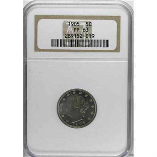 <B>1905 5C PR63 NGC.</B></I> NGC Census: (46/313). PCGS Population (106/306). Mintage: 2,152. Numismedia Wsl. Price for NGC/PCGS coin in PR63: $176. (#3903)<BR><BR><B>Coin Engraver:</B> Charles E. Barber<BR><BR><b>Shipping:</b> Coins & Currency (<a target="_blank" href="http://www.heritageauctions.com/common/shipping.php">view shipping information</a>)
