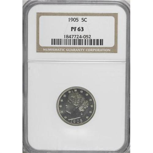 <B>1905 5C PR63 NGC.</B></I> NGC Census: (46/315). PCGS Population (106/306). Mintage: 2,152. Numismedia Wsl. Price for NGC/PCGS coin in PR63: $176. (#3903)<BR><BR><B>Coin Engraver:</B> Charles E. Barber<BR><BR><b>Shipping:</b> Coins & Currency (<a target="_blank" href="http://www.heritageauctions.com/common/shipping.php">view shipping information</a>)