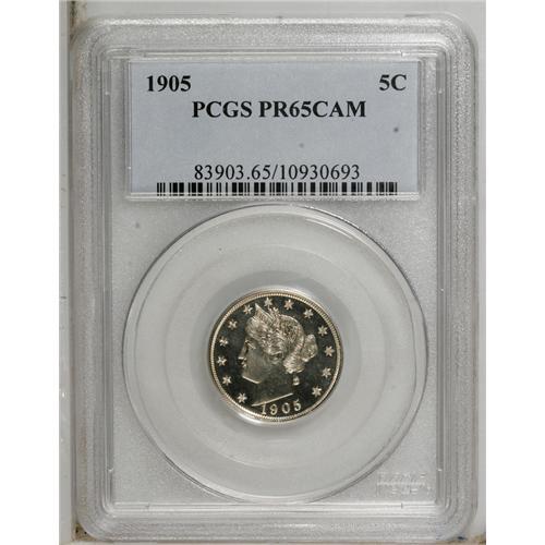 <B>1905 5C PR65 Cameo PCGS.</B></I> Fewer than 20 1905 proof nickels, from a mintage of 2,152 pieces, have been given the Cameo designation by PCGS and NGC. The current Gem Cameo displays some incipient light tan color on the obverse, and is well impressed, save for the usual softness in the leaves and corn ear left of the bowknot. Both sides are well preserved. Population: 6 in 65 Cameo, 2 finer (2/07).<BR><BR><b>Shipping:</b> Coins & Currency (<a target="_blank" href="http://www.heritageauctions.com/common/shipping.php">view shipping information</a>)