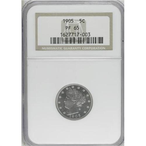 <B>1905 5C PR65 NGC.</B></I> NGC Census: (108/82). PCGS Population (85/48). Mintage: 2,152. Numismedia Wsl. Price for NGC/PCGS coin in PR65: $500. (#3903)<BR><BR><B>Coin Engraver:</B> Charles E. Barber<BR><BR><b>Shipping:</b> Coins & Currency (<a target="_blank" href="http://www.heritageauctions.com/common/shipping.php">view shipping information</a>)