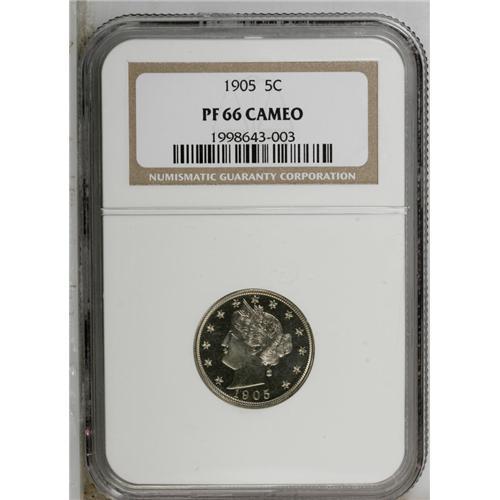 <B>1905<5C> PR66 Cameo NGC.</B></I> Light champagne patina graces each side. The fields are moderately reflective and combine with the delicately frosted devices for significant contrast. Census: 2 in 66 Cameo, 3 finer (9/06).