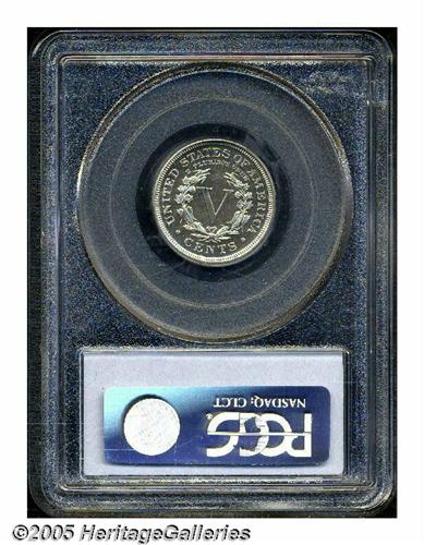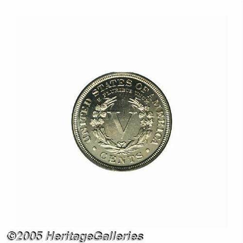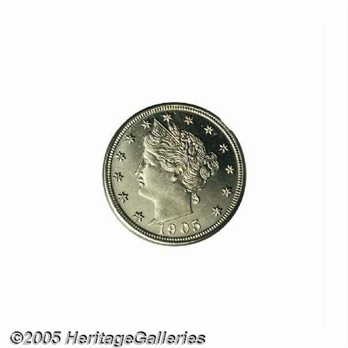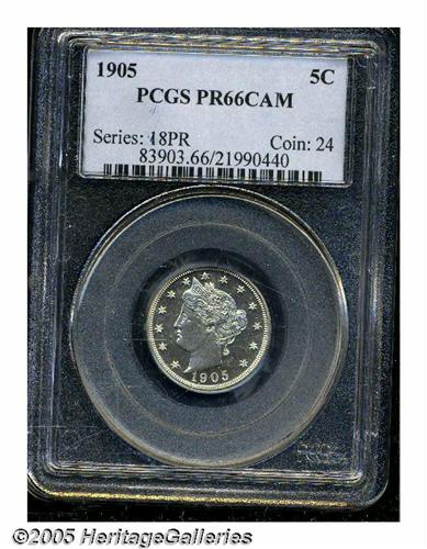 <B>1905<5C> PR66 Cameo PCGS.</B></I> A more deeply mirrored specimen could hardly be imagined for this century-old nickel type coin, being hardly affected by a few faint blushes of milky patina. Few proofs from this year possess enough contrast to qualify for a cameo designation. Population: 2 in 66 Cameo, 0 finer (6/05).