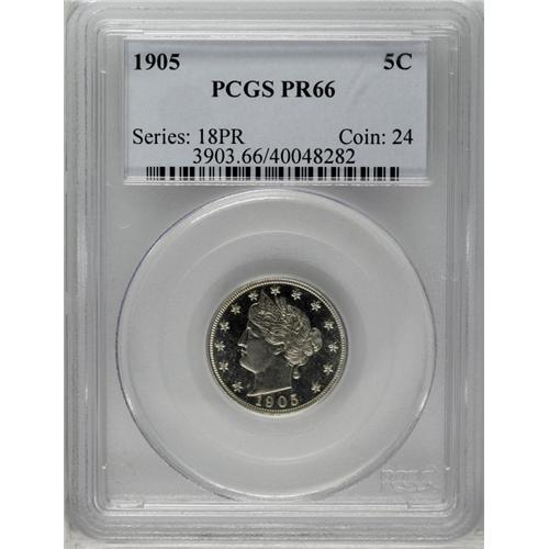 <B>1905<5C> PR66 PCGS.</B></I> Razor-sharp striking details and richly reflective fields are displayed by this seemingly pristine premium Gem proof. The dark fields and mildly frosted devices are subtly contrasted against one another. Population: 34 in 66, 10 finer (5/06).