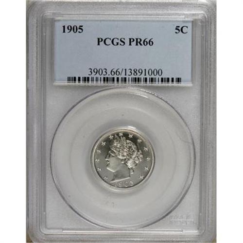 <B>1905 5C PR66 PCGS.</B></I> A brilliant Premium Gem proof with unbelievably deep, watery reflectivity in the fields and razor-sharp striking details. The surfaces seem pristine, or nearly so. The reverse devices are lightly frosted, producing a distinct white-on-black contrast. Population: 37 in 66, 10 finer (6/07). <BR><BR><b>Shipping:</b> Coins & Currency (<a target="_blank" href="http://www.heritageauctions.com/common/shipping.php">view shipping information</a>)