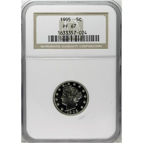 <B>1905 5C PR67 NGC.</B></I> A fully struck and magnificently preserved Superb Gem. Brilliant aside from a hint of golden toning near the cheekbone. Census: 20 in 67, 2 finer (10/06).<BR><BR><b>Shipping:</b> Coin/Currency (<a target="_blank" href="http://www.heritageauctions.com/common/shipping.php">view shipping information</a>)