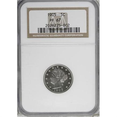 <B>1905 5C PR67 NGC.</B></I> Sharply impressed with fully reflective fields and frosty devices that combine for slight contrast. Both sides offer stunning light blue patination struck with a touch of lavender. In sum, a gorgeous Superb Gem. NGC has graded just two finer proofs (1/08).<BR><BR><B>Coin Engraver:</B> Charles E. Barber<BR><BR><b>Shipping:</b> Coins & Currency (<a target="_blank" href="http://www.heritageauctions.com/common/shipping.php">view shipping information</a>)