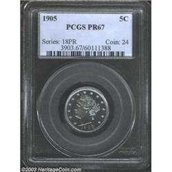 <TABLE cellSpacing=0 cellPadding=0 width="100%" bgColor=#000000 border=0><TBODY><TR><TD width="100%"><TABLE cellSpacing=1 cellPadding=3 width="100%" border=0><TBODY><TR><TD width="100%" bgColor=#79735c><FONT face=arial color=#ffffff size=3><B>Description</B> </FONT></TD></TR><TR><TD width="100%" bgColor=#ffffff><FONT face=arial size=2><B>1905 5C PR67 PCGS.</B></I> Beautiful lilac-blue color is evenly distributed over each side. The striking impression is razor-sharp, and there are no apparent surface blemishes. A lovely Superb Gem, worthy of inclusion in a Registry Set of proof Liberty Head nickels. Population: 9 in 67, 0 finer (8/03). </FONT></TD></TR></TBODY></TABLE></TD></TR></TBODY></TABLE><BR><A name=PricesRealized></A><TABLE cellSpacing=0 cellPadding=0 width="100%" bgColor=#000000 border=0><TBODY><TR><TD width="100%"><TABLE cellSpacing=1 cellPadding=3 width="100%" border=0><TBODY><TR><TD width="100%" bgColor=#79735c><A name=PR><FONT face=arial color=#ffffff size=3><B>Previous Prices from Heritage Auctions</B> </FONT></A></TD></TR><TR><TD bgColor=#f6f6ed><TABLE cellSpacing=0 cellPadding=0 width="100%" border=1><TBODY><TR><TD align=middle width="33%"><B>Date</B></TD><TD align=middle width="33%"><B>Service</B></TD><TD align=middle width="33%"><B>Price</B></TD></TR><TR bgColor=whitesmoke><TD width="33%"><B>01/01/1995</B></TD><TD width="33%">PCGS</TD><TD width="33%">$1,760.00</TD></TR></TBODY></TABLE></TD></TR><TR><TD bgColor=#ffffff><FONT face=arial size=1 ?>PLEASE NOTE: All prices realized reflect the final hammer price PLUS the buyer's premium in auctions that charge a buyer's premium. Each item has a notation at the top of the listing indicating whether that lot included a buyer's premium. Example: A item that sells with a final hammer price of $100 and a 20% buyer's premium will display with a price realized of $120. All information listed is intended to be as accurate as possible, but errors are possible. Please use this guide carefully and inform us of any inaccuracies. </FONT></TD></TR></TBODY></TABLE></TD></TR></TBODY></TABLE><BR><TABLE cellSpacing=0 cellPadding=0 width="100%" bgColor=#000000 border=0><TBODY><TR><TD width="100%"><TABLE cellSpacing=1 cellPadding=3 width="100%" border=0><TBODY><TR><TD width="100%" bgColor=#79735c colSpan=6><FONT face=arial color=#ffffff size=3><B>Price Guide*</B> </FONT></TD></TR><TR bgColor=#f6f6ed><TD align=middle><B>Grade</B> </TD><TD align=middle><B>Coin World<BR>(Trends)</B> </TD><TD align=middle><B>Numismedia<BR>Retail</B> </TD><TD align=middle><B>Numismedia<BR>Wholesale</B> </TD><TD align=middle><B>Coin<BR>Universe</B> </TD><TD align=middle><B>Heritage<BR>Value Index</B> </TD></TR><TR bgColor=#ffffff><TD align=middle>66</TD><TD align=right>---</TD><TD align=right>$990.00</TD><TD align=right>$760.00</TD><TD align=right>$825.00</TD><TD align=right>$835.00</TD></TR><TR style="FONT-WEIGHT: bold" bgColor=#cccfdd><TD align=middle>67</TD><TD align=right>---</TD><TD align=right>---</TD><TD align=right>$1,450.00</TD><TD align=right>$2,400.00</TD><TD align=right>$1,680.00</TD></TR><TR bgColor=#ffffff><TD align=middle>68</TD><TD align=right>---</TD><TD align=right>---</TD><TD align=right>$4,450.00</TD><TD align=right>---</TD><TD align=right>---</TD></TR><TR bgColor=#ffffff><TD colSpan=6><FONT size=1>*All information listed is intended to be as accurate as possible, but errors are possible. No item may be returned or refused based on this information which is provided as a service to our customers. You should contact each pricing source directly to determine the accuracy of this information. </FONT></TD></TR></TBODY></TABLE></TD></TR></TBODY></TABLE><BR><TABLE cellSpacing=0 cellPadding=0 width="100%" bgColor=#000000 border=0><TBODY><TR><TD width="100%"><TABLE cellSpacing=1 cellPadding=3 width="100%" border=0><TBODY><TR><TD width="100%" bgColor=#79735c><FONT face=arial color=#ffffff size=3><B>Population Guide</B> </FONT></TD></TR><TR bgColor=#ffffff><TD align=middle><!-- Begin Output of Population Grid--><TABLE cellSpacing=0 cellPadding=0 width="100%" border=0><TBODY><TR><TD vAlign=center><TABLE cellSpacing=0 width="100%" border=1 cellsadding="3"><TBODY><TR><TD vAlign=center><TABLE cellSpacing=0 cellPadding=3 width="100%" border=1><TBODY><TR><TD vAlign=center align=middle bgColor=#f0f1e8 colSpan=2 <CENTER><FONT face=Arial size=2><B>PCGS Pop </B></FONT><CENTER></CENTER></TD><TD vAlign=center align=middle bgColor=#f0f1e8 colSpan=2><CENTER><FONT face=Arial size=2><B>NGC Pop</B></CENTER></FONT></TD></TR><TR><TD vAlign=center><FONT face=Arial size=2>(67)</FONT> </TD><TD vAlign=center align=right><FONT face=Arial size=2>9</FONT> </TD><TD vAlign=center><FONT face=Arial size=2>(67)</FONT> </TD><TD vAlign=center align=right><FONT face=Arial size=2>16</FONT> </TD></TR><TR><TD vAlign=center><FONT face=Arial size=2>(>67)</FONT> </TD><TD vAlign=center align=right><FONT face=Arial size=2>0</FONT> </TD><TD vAlign=center><FONT face=Arial size=2>(>67)</FONT> </TD><TD vAlign=center align=right><FONT face=Arial size=2>2</FONT> </TD></TR></TBODY></TABLE></TD></TR></TBODY></TABLE></TD></TR></TBODY></TABLE><!-- End Output of Population Grid--> Important notice: Heritage usually auctions material at the rate of 200-250 lots per hour. On some occasions eBay Live bid software or the Internet may not be able to keep up with the pace of the auction. We recommend placing a realistic absentee bid now as insurance to avoid disappointment. Occasionally the auctioneer may eliminate or reject an eBay Live bid, and the auctioneer may also reopen a lot after the close of the eBay live bidding (usually because we missed an audience bid), and may reject your bid even if it shows you as the winning bidder. By bidding via eBay Live, you agree that Heritage may award the lot to another bidder at its sole discretion under the circumstances described above or any other reasonable circumstances. Also please note that all Heritage lots purchased through eBay Live carry a 20% Buyer's Premium. Ple
