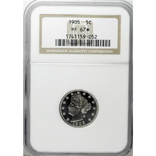 <B>1905 5C PR67 <img border='0' src='http://www.heritagecoins.com/images/star.gif' width=10 height=10> NGC.</B></I> This piece is the <I>only</B></I> proof of this issue to receive the Star Designation (10/06). The honor is well-deserved, with deep reflectivity beneath turquoise patina. Modest contrast enhances the already overwhelming eye appeal. A coin to remember.<BR><I>From The James Paul Collection.</B></I><BR><BR><b>Shipping:</b> Coin/Currency (<a target="_blank" href="http://www.heritageauctions.com/common/shipping.php">view shipping information</a>)