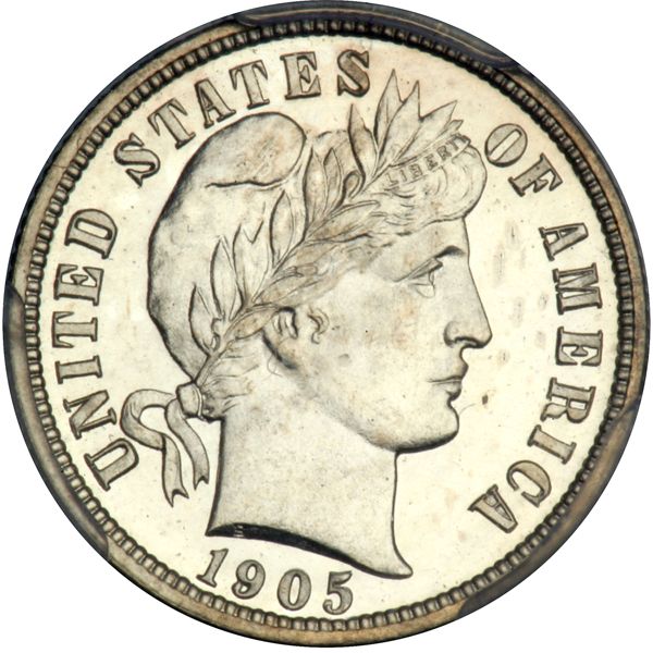 1905 Barber Dime. PCGS graded Proof 65 Cameo CAC Approved. Only 727 struck. A dazzling white Gem. Fully struck and extraordinarily clean with thick, creamy mint frosted Liberty and wreath. Entirely brilliant. Pop 14; 17 finer (PCGS # 84889) .