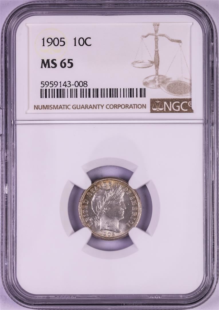 One 1905 Barber Dime Coin NGC MS65. NGC Certified.