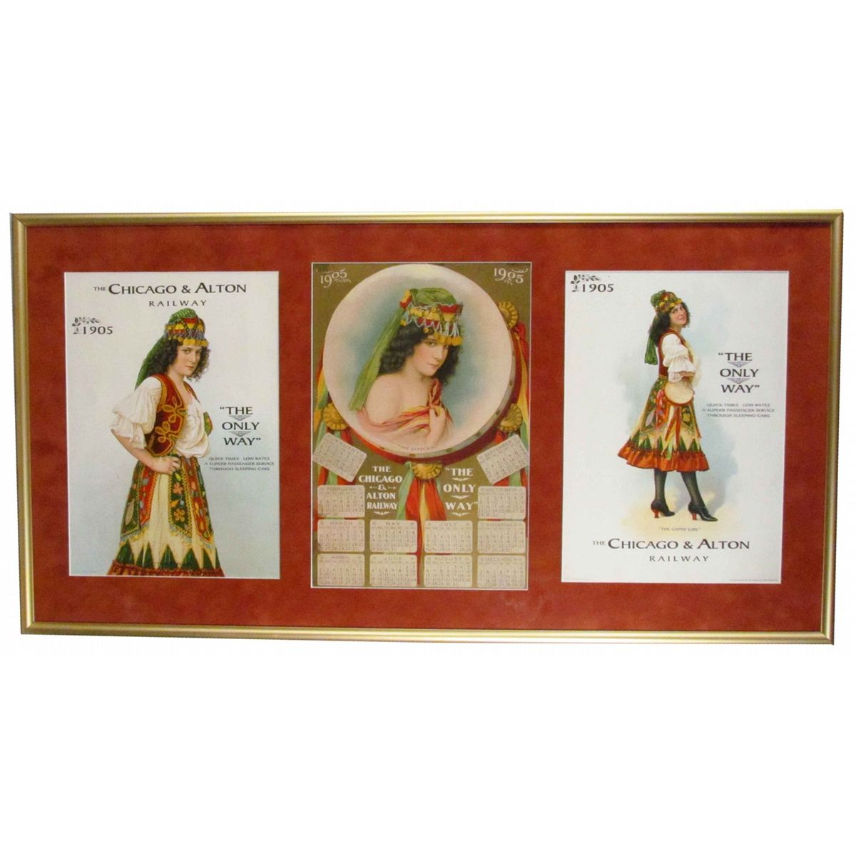 1905 Calendar for The Chicago & Alton Railway. 2 1905 advertisements and calendar featuring "The Gypsy Girl". Framed under glass. 38 1/4 X 19 inches overall.