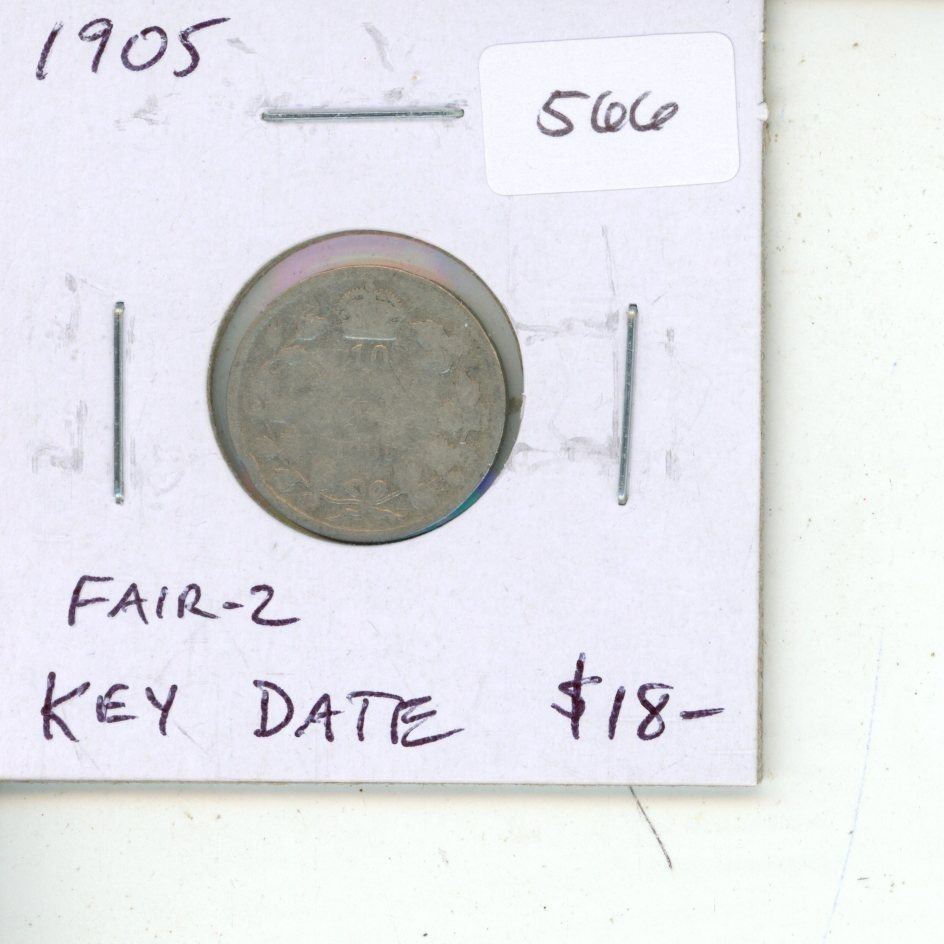 1905 Canadian Silver 10 Cents. Key Date. Fair-2.