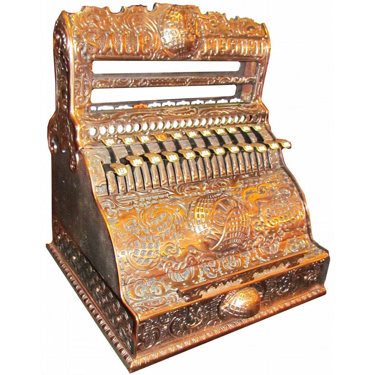 1905 World Cash Register. The Detroit Tobacco Co. would send "Free" register when you ordered 1000 cigars. Solid nickel case, self adding cash register. Beautiful Copper flashed restored finish. Not fully functional, comes with key.