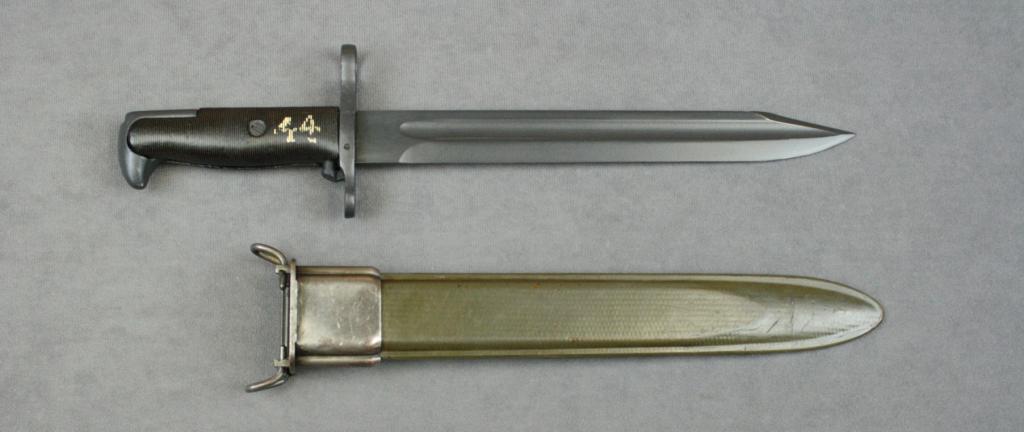 1905 E1 short U.S. military bayonet with  sheath marked U.F.H. with U.S. and flaming  bomb proof dated 1942 in overall very good to  fine condition.  Est.:  $175-$350.