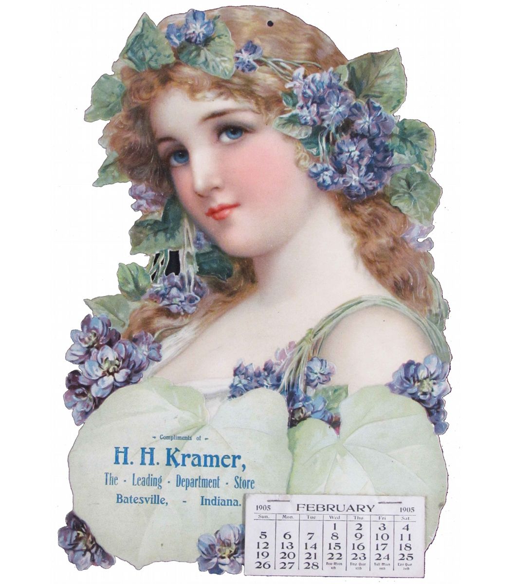 1905 Embossed Die Cut Calendar for H.H. Kramer. Leading Dept. Store, Batesville, IN. Feb-Dec Pages. Near mint condition. Framed under glass. 8 X 11 1/2 image only.