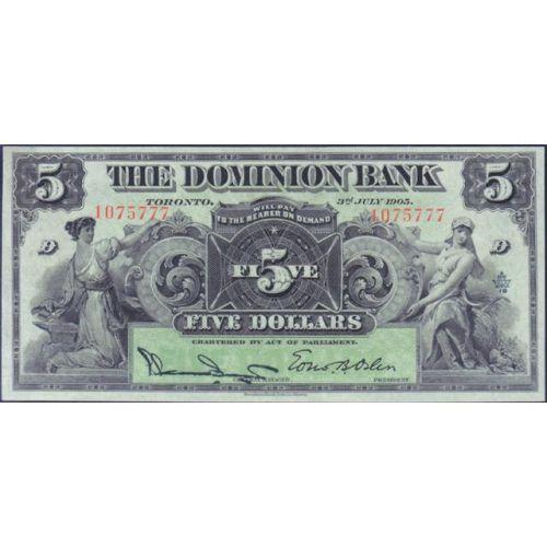 1905 Five Dollars The Dominion Bank, Bogert, CH 220-16-10 Serial Number 1075777 D, PMG Extremely Fine 45