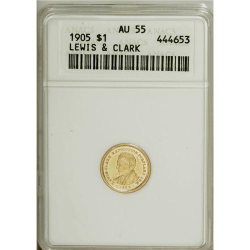 <B>1905 G$1 Lewis and Clark AU55 PCGS.</B></I> Light friction on the cheekbone of Captain William Clark denies a finer grade, but this briefly handled piece has nearly full luster, and the eye appeal is comparable with many Uncirculated examples.<BR><BR><b>Shipping:</b> Coin/Currency (<a target="_blank" href="http://www.heritageauctions.com/common/shipping.php">view shipping information</a>)