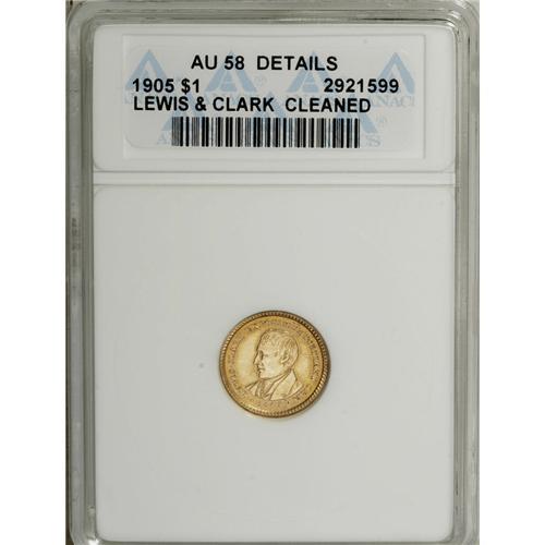 <B>1905 G$1 Lewis and Clark--Cleaned--ANACS. AU58 Details.</B></I> NGC Census: (53/948). PCGS Population (108/1759). Mintage: 10,000. Numismedia Wsl. Price for NGC/PCGS coin in AU58: $940. (#7448)<BR><BR><b>Shipping:</b> Coin/Currency (<a target="_blank" href="http://www.heritageauctions.com/common/shipping.php">view shipping information</a>)