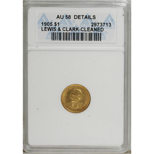 <B>1905 G$1 Lewis and Clark--Cleaned--ANACS. AU58 Details.</B></I> This piece appears prooflike upon first glance, but close inspection reveals faint hairlines and a trace of friction on Lewis' cheekbone.<BR><BR><b>Shipping:</b> Coins & Currency (<a target="_blank" href="http://www.heritageauctions.com/common/shipping.php">view shipping information</a>)