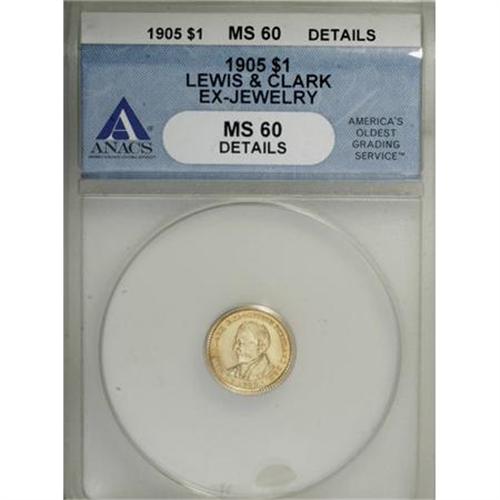 <B>1905 G$1 Lewis and Clark--Ex-Jewelry--ANACS .MS60 Details.</B></I> NGC Census: (5/998). PCGS Population (36/1816). Mintage: 10,000. Numismedia Wsl. Price for NGC/PCGS coin in MS60: $1,285. (#7448)<BR><BR><b>Shipping:</b> Coins & Currency (<a target="_blank" href="http://www.heritageauctions.com/common/shipping.php">view shipping information</a>)