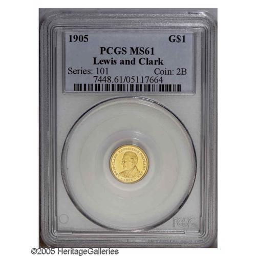 <B>1905<G$1> Lewis and Clark MS61 PCGS.</B></I> Subtly variegated color but somewhat lackluster. A grade-limiting mark is seen across the face of Clark.