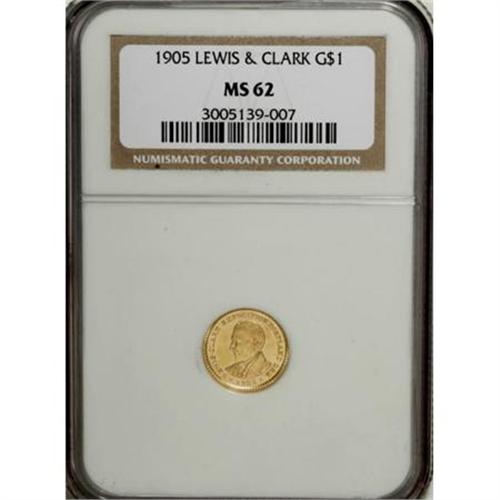 <B>1905 G$1 Lewis and Clark MS62 NGC.</B></I> Bright overall with attractive, semi-prooflike fields. An affordable example of this scarce commemorative gold coin.<BR><BR><b>Shipping:</b> Coins & Currency (<a target="_blank" href="http://www.heritageauctions.com/common/shipping.php">view shipping information</a>)