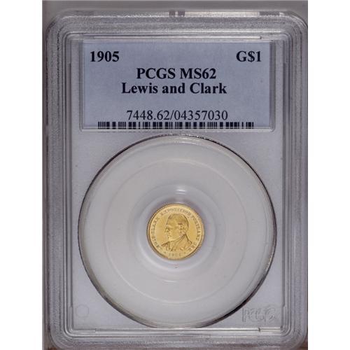 <B>1905 G$1 Lewis and Clark MS62 PCGS.</B></I> Brilliant and satiny with rich yellow gold luster. An excellent example of this scarce commemorative gold dollar.