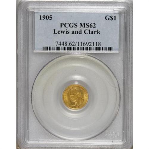 <B>1905 G$1 Lewis and Clark MS62 PCGS.</B></I> A well struck yellow-orange representative of this second-year issue, the first of only two instances where a gold commemorative design carried over to a second year. Light, scattered marks that appear on the lustrous surfaces account for the grade.<BR><BR><b>Shipping:</b> Coins & Currency (<a target="_blank" href="http://www.heritageauctions.com/common/shipping.php">view shipping information</a>)