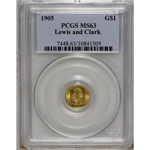 <B>1905 G$1 Lewis and Clark MS63 PCGS.</B></I> Highly lustrous brassy-gold surfaces exhibit some light granularity, especially around the borders, and the design elements are generally well impressed. Some wispy handling marks define the coin's grade. From a relatively small mintage of 10,000 pieces.<BR><BR><b>Shipping:</b> Coin/Currency (<a target="_blank" href="http://www.heritageauctions.com/common/shipping.php">view shipping information</a>)