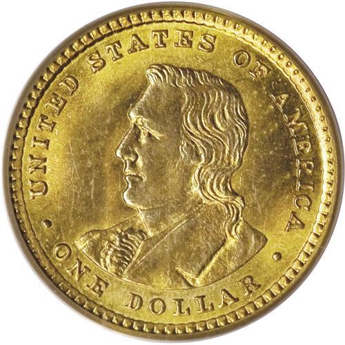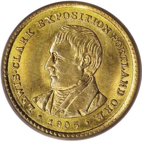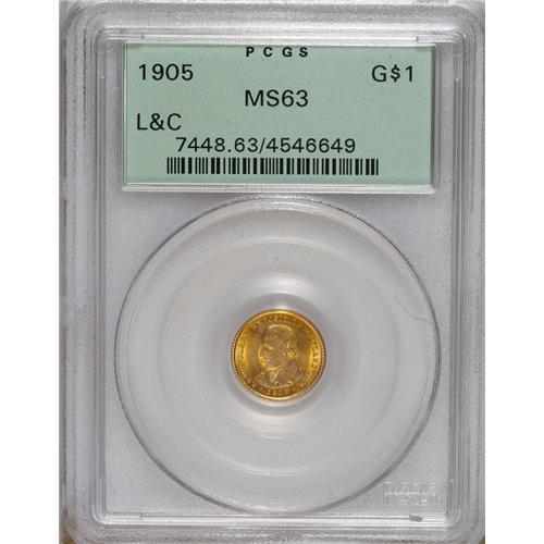 <B>1905 G$1 Lewis and Clark MS63 PCGS.</B></I> Orange-gold luster is prevalent, although dashes of powder-blue are also present. A sharply struck and lightly abraded representative of this early commemorative gold issue. Struck for the 1905 Lewis and Clark Exposition, held in Portland, Oregon. Encased in a green label holder.<BR><BR><b>Shipping:</b> Coins & Currency (<a target="_blank" href="http://www.heritageauctions.com/common/shipping.php">view shipping information</a>)