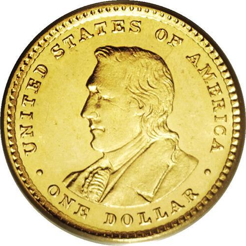 <B>1905<G$1> Lewis and Clark MS63 PCGS.</B></I> This is our nation's only two-headed coin issue. Capt. Meriwether Lewis is on one side and Capt. William Clark on the other, with no wreath or eagle on the "reverse," only the denomination. The 1905 issue appears to be considerably scarcer in higher grades than the 1904. This nice yellow-gold example is kept in the Select grade only by a few scattered abrasions.