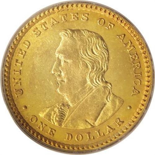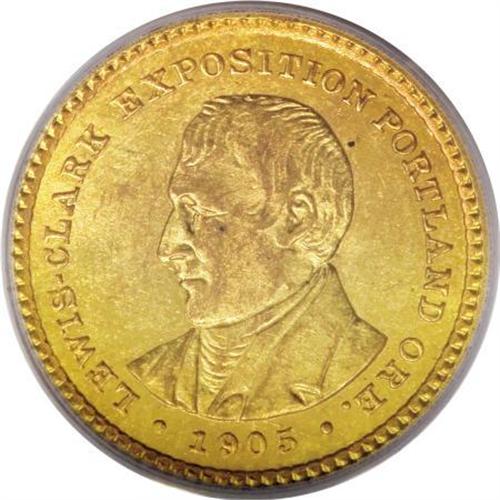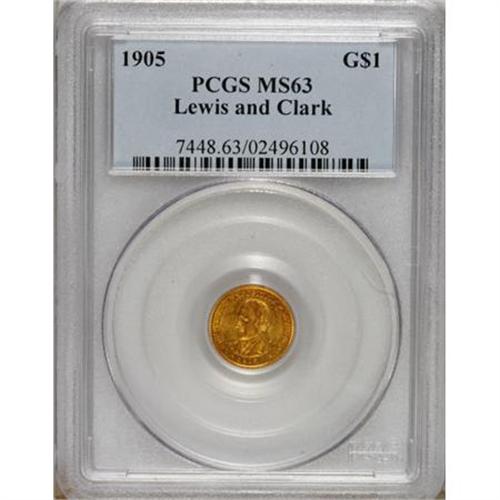 <B>1905 G$1 Lewis and Clark MS63 PCGS.</B></I> Gorgeous orange-gold patination, imbued with faint hints of light green, lavender, and light blue, runs over highly lustrous surfaces. The strike is impressive, resulting in rather sharp definition on the design elements, including excellent definition in the hair strands on both portraits. Many examples have been cleaned or otherwise mishandled in some way, making original, undamaged pieces numismatic prizes.<BR><BR><b>Shipping:</b> Coins & Currency (<a target="_blank" href="http://www.heritageauctions.com/common/shipping.php">view shipping information</a>)
