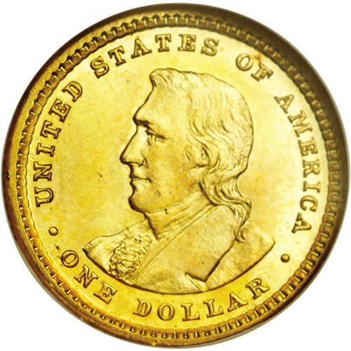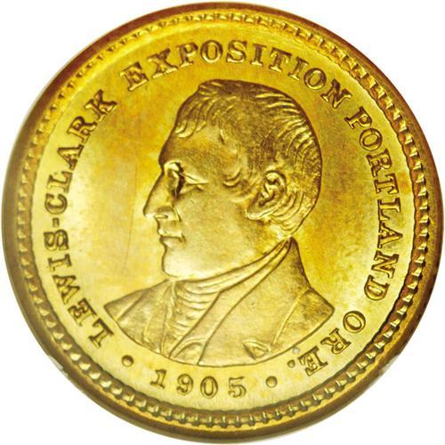 <B>1905<G$1> Lewis and Clark MS64 NGC.</B></I> A beautiful melange of apricot, yellow, and orange-gold and lime-green coloration bathes radiantly lustrous surfaces on both sides. There is a hint of prooflikeness in the fields, that results in the enhancement of the sharply impressed design features when the coin is rotated under a light source. A few inoffensive stray handling marks on the obverse keep this marvelous piece from having achieved full Gem status.