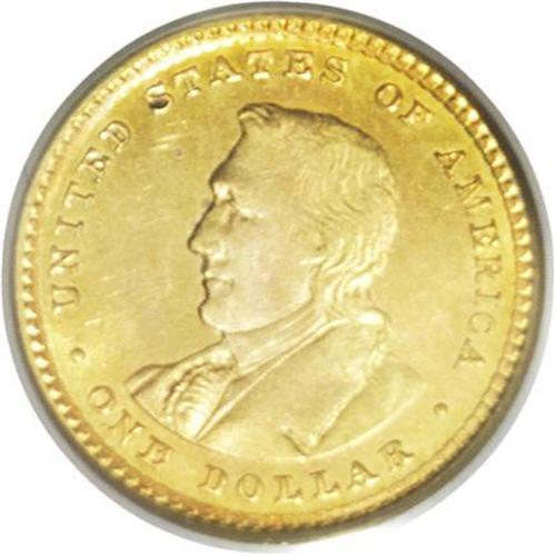 <B>1905<G$1> Lewis and Clark MS64 PCGS.</B></I> Bright honey toning adorns the fields. The portraits display light olive and lilac. Intense evaluation beneath a strong loupe reveals a few nearly imperceptible hairlines that limit the grade. The eye appeal, however, is exceptional. An inconspicuous spot is noted on the first S in STATES.