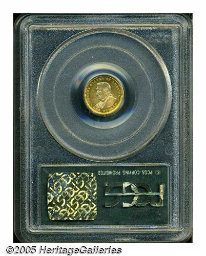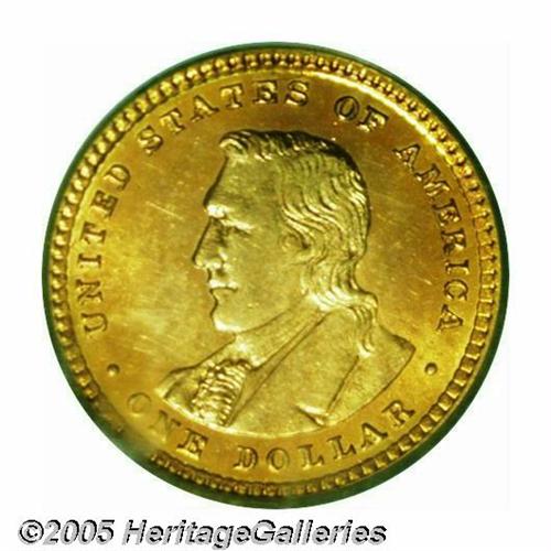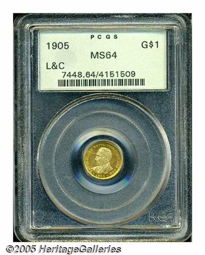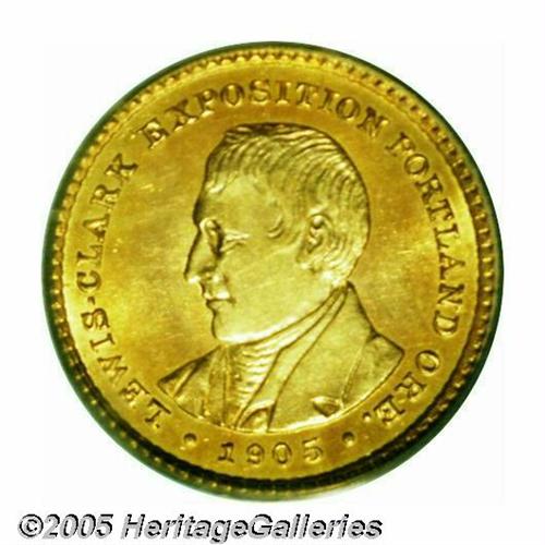 <B>1905<G$1> Lewis and Clark MS64 PCGS.</B></I> Deep orange-gold patina frames the sharply contrasting lilac coloration over the portraits of the explorers. A crisply struck and carefully preserved near-Gem. 10,041 pieces were struck for the second and final year of this popular two-headed type. Many examples were subsequently impaired by usage as jewelry, and original representatives are prized by Commemorative Gold specialists. Encapsulated in a green label PCGS holder. Population: 596 in 64, 234 finer (3/05).