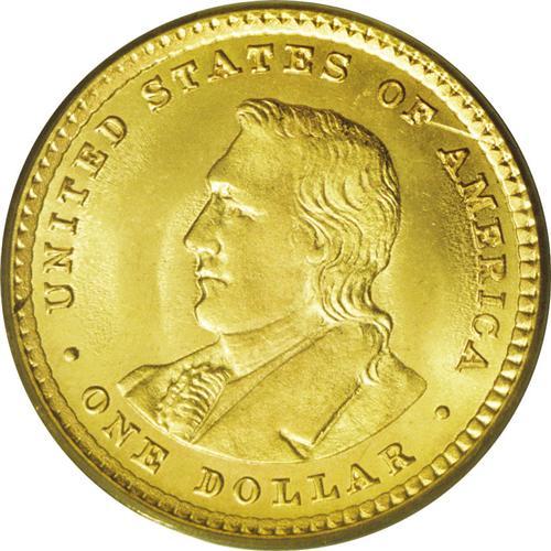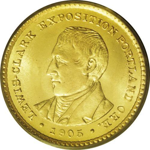 <B>1905<G$1> Lewis and Clark MS64 PCGS.</B></I> Radiantly lustrous surfaces are covered in rich yellow-gold patina imbued with subtle traces of lime-green. Sharp impressions prevail on the design elements, and some "orange-peel" texture is occasionally seen on both sides. A fine, unobtrusive scratch is noted on the obverse portrait, and another in the upper right reverse.