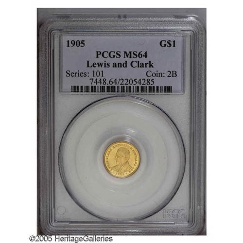 <B>1905<G$1> Lewis and Clark MS64 PCGS.</B></I> Satiny and attractive with bright yellow-gold surfaces. Slightly weak at the centers as usual. A few faint hairlines are visible in the fields.