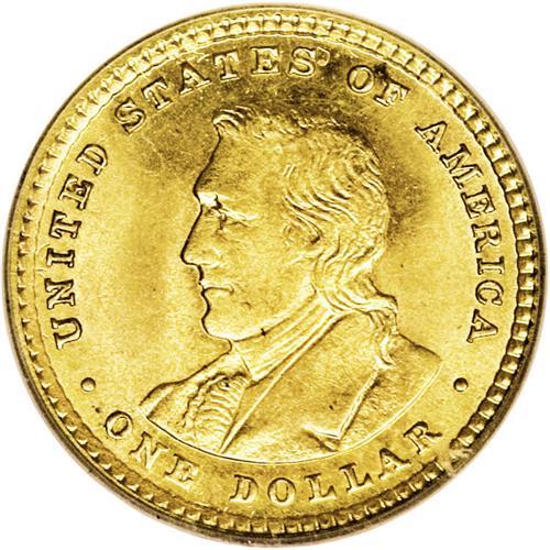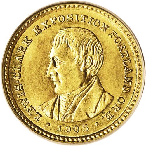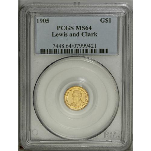 <B>1905 G$1 Lewis and Clark MS64 PCGS.</B></I> Well struck and lustrous, with a pleasing amalgam of green and orange-gold toning over both sides. The wispy marks above UNITED STATES are mint-made and unimportant to the grade or the eye appeal. A couple of faint pinscratches in the left obverse field, however, do serve to limit the grade.<BR><BR><b>Shipping:</b> Coin/Currency (<a target="_blank" href="http://www.heritageauctions.com/common/shipping.php">view shipping information</a>)